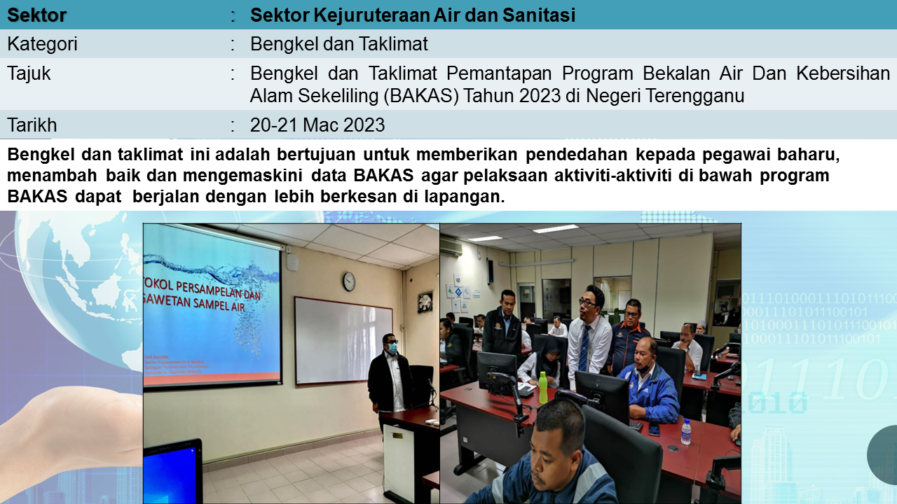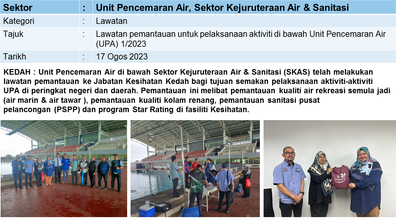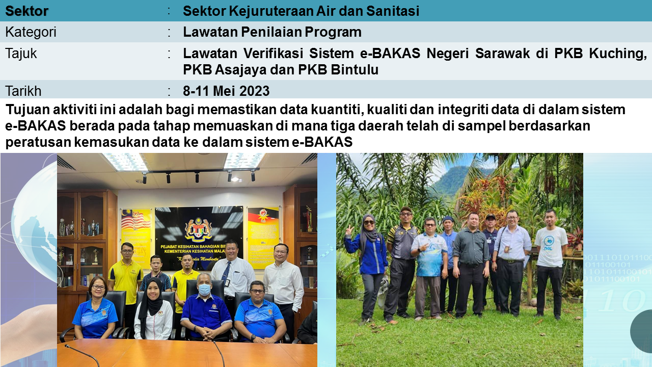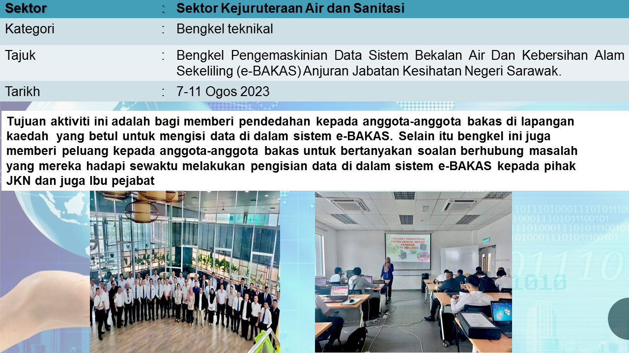 Aktiviti Sektor Kejuruteraan Air dan Sanitasi mempunyai tiga program utama yang merangkumi Bekalan Air dan Kebersihan Alam Sekililing (BAKAS), Program Kawalan Mutu Air Minum (KMAM) dan Unit Pencemaran Air (UPA).