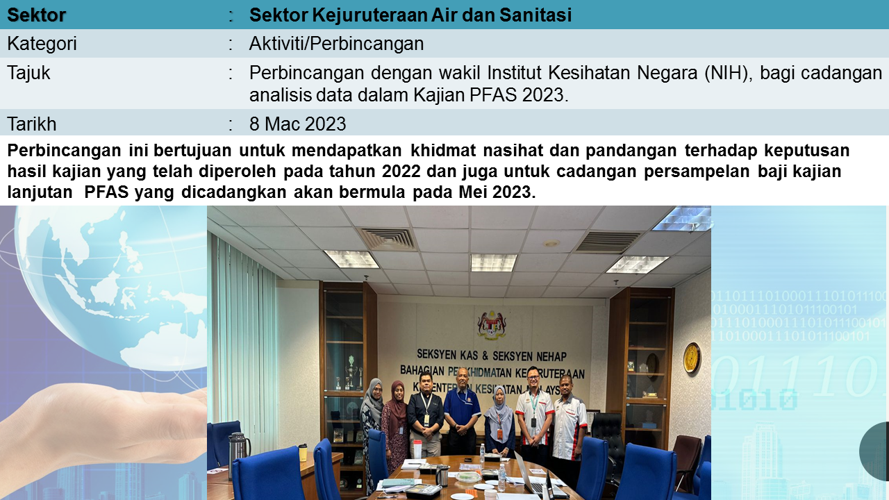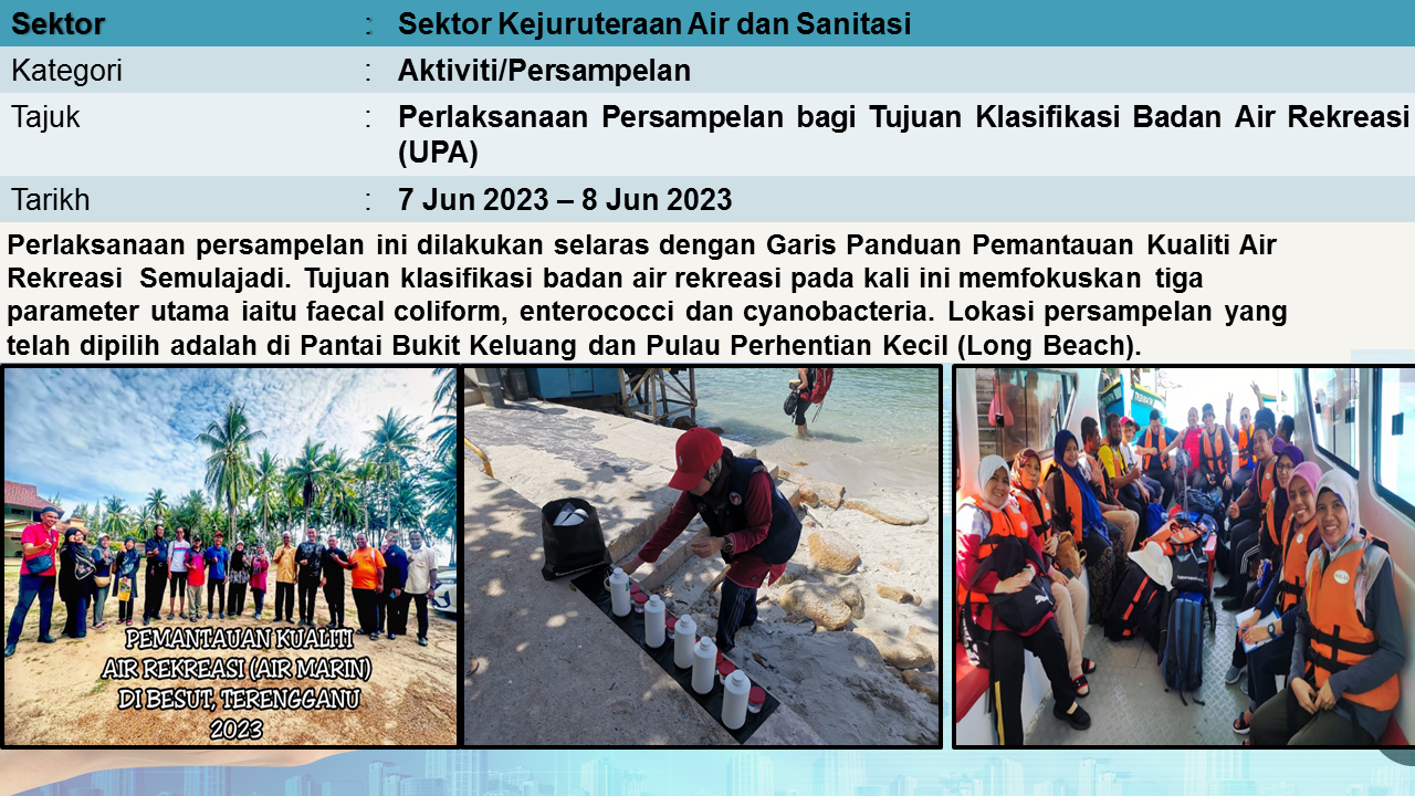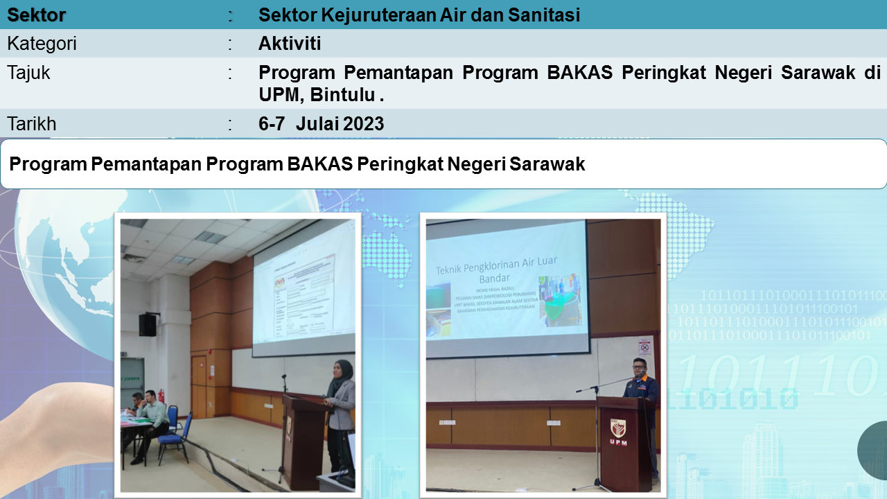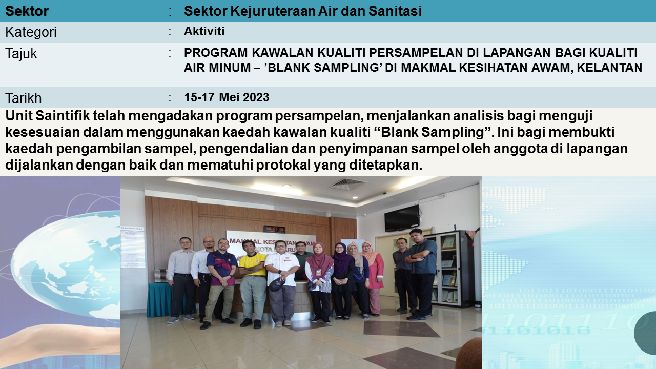 Aktiviti Sektor Kejuruteraan Air dan Sanitasi mempunyai tiga program utama yang merangkumi Bekalan Air dan Kebersihan Alam Sekililing (BAKAS), Program Kawalan Mutu Air Minum (KMAM) dan Unit Pencemaran Air (UPA).