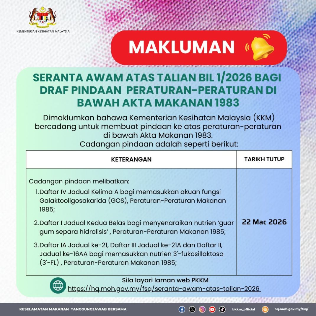 Mulai 15 Mac 2021 semua industri makanan boleh membuat Pendaftaran dan menggunakan sistem FOSIM 2.0.