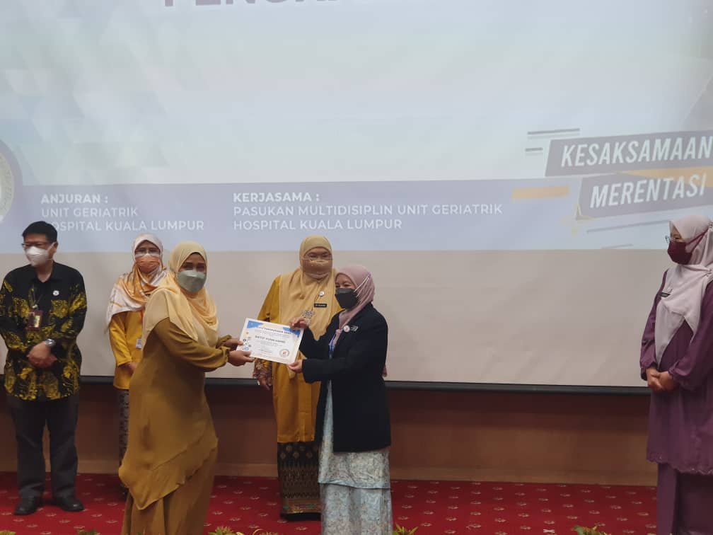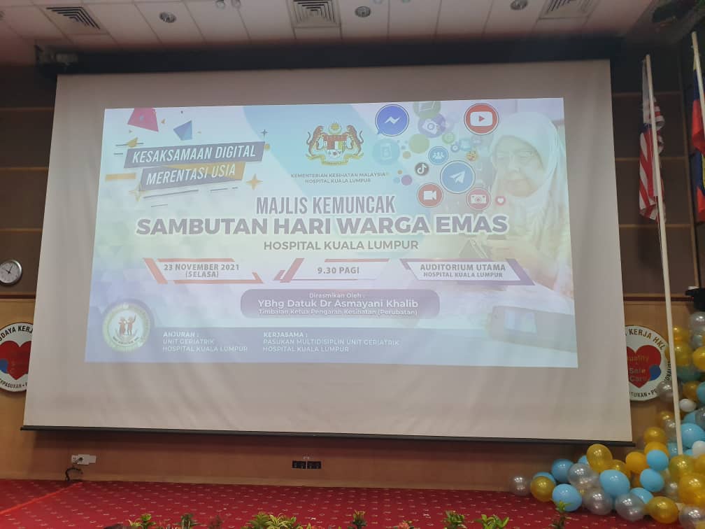 Pada 23 November 2021, YBhg Dato’ Dr. Asmayani (Timbalan Ketua Pengarah Kesihatan Perubatan) telah dijemput untuk merasmikan Majlis Kemuncak Sambutan Hari Warga Emas Antarabangsa (‘International Day of Older Persons 2021’) Peringkat Hospital Kuala Lumpur. Turut hadir bersama Timbalan Pengarah Kanan, Cawangan Perkembangan Perkhidmatan Perubatan, Datin Seri Dr Asmah binti Samat, Pengarah Hospital Kuala Lumpur, Dr Rohana bt Johan, Timbalan Pengarah Perubatan, Dr Shahrum binti Ismail dan Ketua Jabatan Perubatan Am, merangkap Ketua Perkhidmatan Perubatan Geriatrik KKM, Dr Yau Wen Keong. Penampilan istimewa: Dr Lee Fatt Soon, Mantan Ketua Perkhidmatan Geriatrik KKM.
