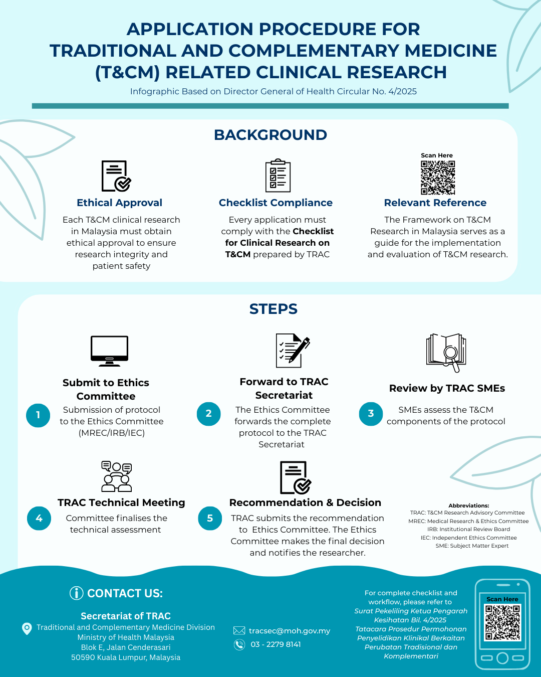 Please be informed that the Standard Operating Procedures for the Traditional and Complementary Medicine Unit in the Ministry of Health Hospitals have been updated, with the addition of the Standard Operating Procedures (SOP) for Inpatient Acupuncture and Traditional Malay Massage (TMM) Services, and can be accessed via the following link (CLICK HERE). 09-01-2026