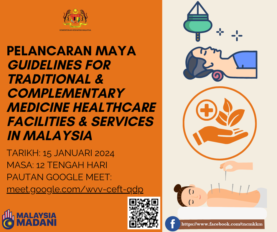 Sukacita dimaklumkan Bahagian Perubatan Tradisional dan Komplementari, Kementerian Kesihatan Malaysia telah membangunkan satu garis panduan baharu iaitu Guidelines for Traditional and Complementary Medicine Healthcare Facilities and Services in Malaysia. Garis panduan ini akan menjadi satu panduan kepada semua pengamal PT&K dan pemilik fasiliti kesihatan PT&K yang ingin memberikan perkhidmatan PT&K yang selamat dan berkualiti kepada rakyat Malaysia. Sehubungan itu, Bahagian ini ingin menjemput anda ke majlis pelancaran maya garis panduan tersebut mengikut ketetapan berikut: